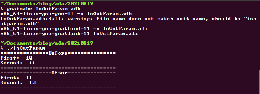 end InOutParam;이제 컴파일을 해보고, 작동을 해보면